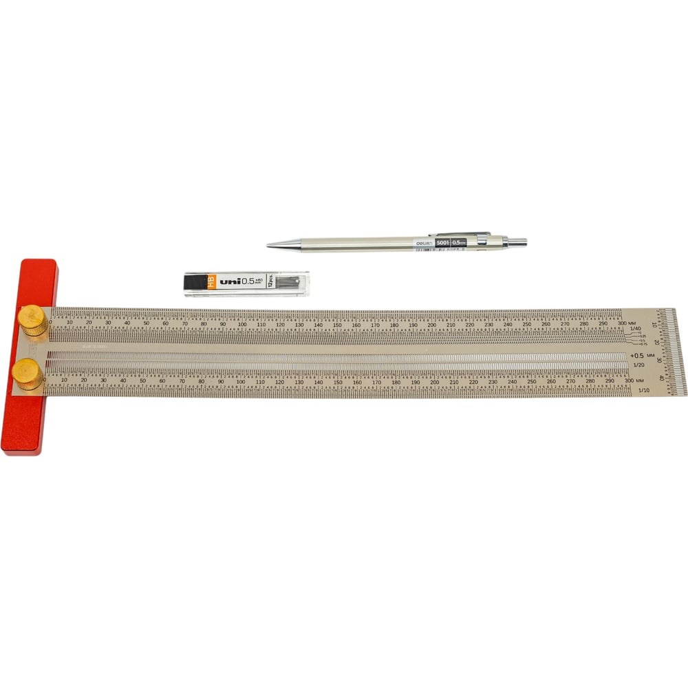 Разметочная линейка WOODWORK T-образная, 300 мм, с карандашом RUL-30T снабжена упором, который позволяет позиционировать линейку точно перпендикулярно краю заготовки, при том что нулевая отметка гарантированно находится на краю заготовки. За счет того, что линейка изготовлена из упругого тонкого материала, разметку можно производить не только на плоских, но и на вогнутых и выпуклых поверхностях. На линейке имеются несколько разметочных шкал, первая из которых имеет круглые отверстия, расположенные с шагом в 1 мм. Базовая опора линейки может использоваться как направляющая, которую нужно двигать вдоль заготовки для разметки, при этом карандаш должен быть установлен в соответствующее отверстие на линейке. Помимо круглых отверстий на линейке имеются также вертикальные и горизонтальные продольные пазы, также расположенные с шагом 1 мм, которые используются для проведения параллельных и горизонтальных коротких линий разметки. Кроме этого на линейке имеется специальная разметка в виде наклонных рисок, шаг которых составляет 1 мм. Эти риски выполнены с наклоном и на каждой из них имеются четыре отверстия, в результате получается три дополнительных уровня относительно базового отверстия. Отверстия расположены таким образом, что шаг этих дополнительных уровней разметки составляет 0,25 мм, благодаря чему при разметке появляется возможность добавить к каждому мм 0.25 мм, 0.5 мм или 0.75 мм.