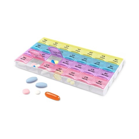 Таблетница представляет собой пластиковый контейнер, состоящий из 28 отделений, для организации хранения и приема лекарственных средств 4 раза в день 7 дней в неделю. Таблетница удобна и надежна в транспортировке, помогает упорядочить прием витаминов и лекарств дома, на работе и в путешествии.