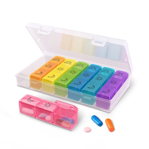 Каждый из контейнеров в наборе выполнен в различных ярких цветах, и содержит маркировку, соответствующую суточному режиму приема лекарств: утро, день, вечер. Маркировка выполнена при помощи специальной УФ печати. Надписи не сотрутся от длительного и частого использования.