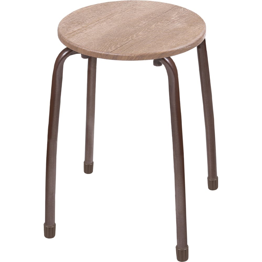 Табурет на четырех опорах с сиденьем из МДФ с древесным декором. Пластиковые колпачки на ножках защищают поверхность пола от царапин. Конструкция стула позволяет легко штабелировать несколько изделий.