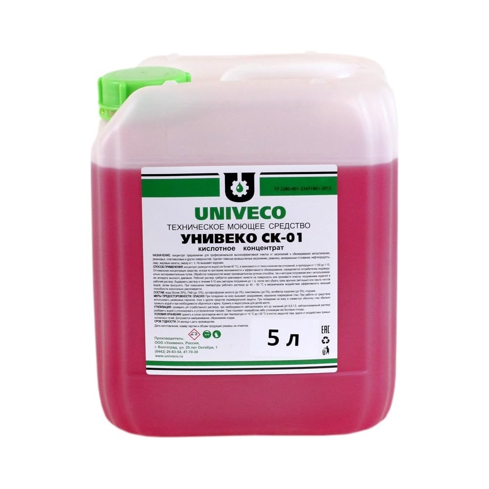Унивеко-СК-01 — концентрированное кислотное средство предназначено для профессиональной очистки металлических поверхностей от ржавчины, окислов и известковых налётов, а также очистки от следов смазки, жировых налётов и синтетических масел. Используется в качестве обезжиривателя перед нанесением лакокрасочных, гальванических, полимерных и других покрытий, является заменой уайт-спирита, ацетона, керосина. Создает защитный фосфатный слой! Способы применения: Используется в виде водного раствора. Обработка поверхностей может производиться как ручным способом, так и методом погружения или с использованием аппарата высокого давления. При повышении температуры рабочего раствора до 40-60 °С эффективность средства значительно увеличивается. Рекомендуемые концентрации: Для металлических поверхностей со слабыми загрязнениями и небольшой ржавчиной: 1-3%. Для средне загрязненных поверхностей: 5-10%. Для особо сильных загрязнений: 20%.