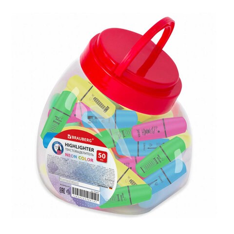 Текстовыделители неоновых цветов: желтый, зеленый, розовый, голубой, имеют овальную форму корпуса, диаметр которого 27 мм. Скошенный наконечник имеет толщину линии письма от 1 до 5 мм, что обеспечивает удобство при работе с текстом, напечатанным мелким шрифтом, или таблицами. Благодаря особой водной основе чернил текстовыделитель не высыхает без колпачка в течение 4 часов. Текстовыделитель обладает экономным расходом чернил, при этом длина линии письма достигает 250 метров. Чернила быстро впитываются и тем самым предотвращают размазывание в процессе использования. Цвет колпачка и корпуса текстовыделителя соответствует цвету чернил. Поставляются в тубе по 50 штук, отлично подходят для размещения в розничном магазине.
