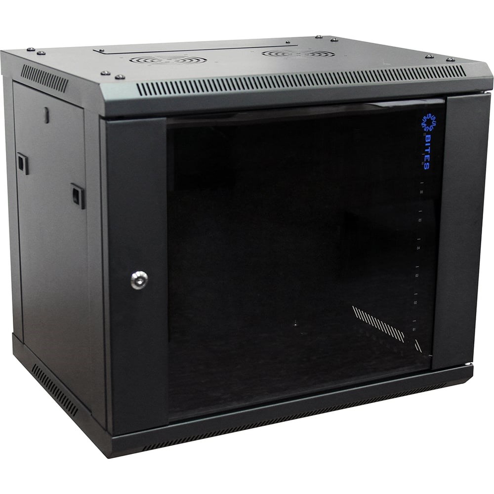 Телекоммуникационный шкаф 5Bites 9U / 600x450 / WALL / BLACK TC6401-09B для настенного монтажа. Современный дизайн, быстрая и простая сборка шкафа, прочная сварная рама из 1.5 мм стального профиля. Максимальная нагрузка: до 60 кг. Заземление: на корпусе. боковые панели: на защелках. Кабельный ввод: в верхней и нижней крышках. Передняя дверь: из тонированного ударопрочного стекла 5 мм в металлической раме с замком. Вертикальные направляющие: две пары с маркировкой в юнитах и регулировкой по глубине. Вентиляция: естественная с возможностью установки вентиляторного модуля на верхней крышке. Материал корпуса: холоднокатаная сталь с порошковым покрытием. Гарантия: 1 год.