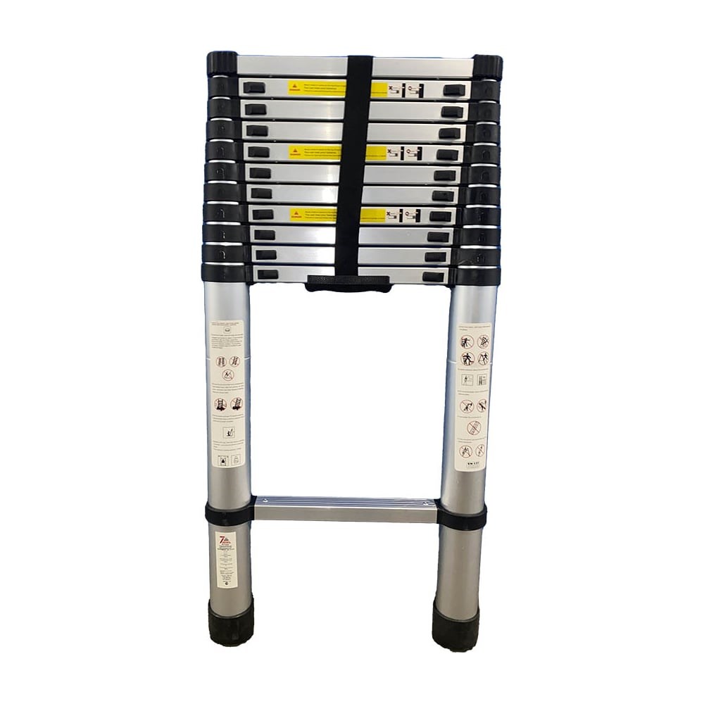 Телескопическая лестница SevenBerg QH-12 4,6 м. очень удобна для транспортировки. Она имеет минимальный размер в сложенном состоянии. Лестницу легко можно разложить на нужную длину и также легко сложить. Для этого потребуется только нажать на 2-а лепестка на ступенях. Так как модель состоит из нескольких секций, она имеет больший прогиб, чем односекционные приставные лестницы. Поэтому её не используют для работ, связанных с повышенной нагрузкой или монтажных работах. При выборе это нужно учитывать. В остальном телескопическая лестница очень привлекательна для работ дома, на участке, для замены лампочек и других бытовых работ.
