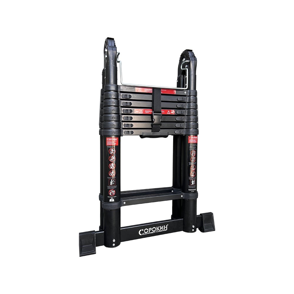 Лестница универсальна: может применяться как двусторонняя стремянка и как приставная лестница. Основное преимущество – выдвижная конструкция, которая в сложенном состоянии компактна и не требует много места при хранении и при перевозке. Чтобы ее разложить, достаточно потянуть за верхнюю ступень вверх. Характерный щелчок означает, что уровень зафиксирован, можно вытягивать следующий. Благодаря телескопическому выдвижению секций от перекладины к перекладине возможно применение на лестницах, уступах, неровных поверхностях без дополнительных принадлежностей. Противоскользящие двухкомпонентные опорные заглушки препятствуют скольжению по гладкому полу. Секции телескопической лестницы состоят из опорных труб и перекладин – в зависимости от необходимости, высота лестницы может быть изменена. Перед использованием обязательно проверьте правильность установки лестницы! Соблюдайте угол наклона к стене (65-75°) и обязательно используйте страховочные пояса и другие страховочные приспособления!!! На каждой ступени имеются пластиковые фиксаторы. Лестница пригодна для использования только тогда, когда все фиксаторы встанут на свои места и защелкнутся. Шарниры должны быть заблокированы перед использованием лестницы! Фиксированное положение шарнира - 30, 105 и 180 градусов! Механизмы блокировки издают характерный щелчок при использовании, но, несмотря на это, ВСЕГДА визуально проверяйте, что рычаги заблокированы.