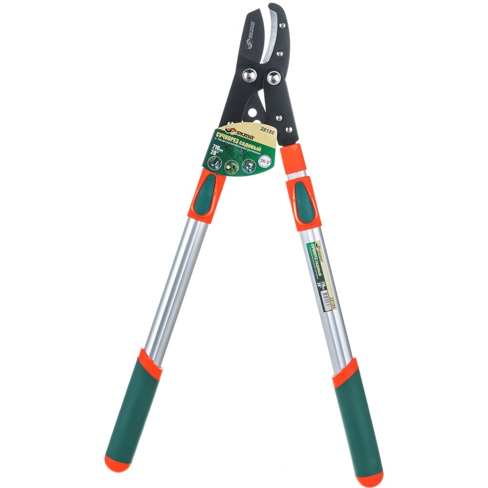 Сучкорез SKRAB телескопический, контактный 670-1020мм SK5 28186 с трещоточным механизмом позволяет отрезать как сухие так и живые ветки диаметром до 40 мм. Прочные телескопические ручки выполнены из усиленного алюминиевого профиля, раздвигаются на 350 мм, увеличивая длину до 1020 мм, позволяют дотянуться до самых высоких веток. Защищенное от коррозии острое, заточенное с двух сторон лезвие сучкореза изготовлено из японской стали SK-5 специально предназначено для быстрого аккуратного реза, не повреждающего кору, имеет тефлоновое покрытие.