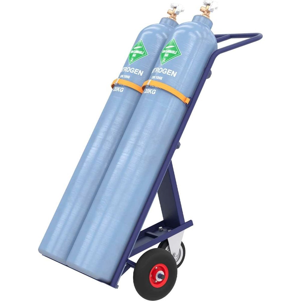 Тележка для двух баллонов RUSKLAD ГБ 2 с литыми колёсами и системой фиксации баллонов- ремень. ГБ 2 литые РЕМЕНЬ служит для перевозки 2-ух баллонов (кислородного, ацетиленового или углекислотного). Изделие выполнено из прочных материалов, каркас представляет собой трубы диаметром 25 мм. Баллон крепится к каркасу ремнём.Благодаря полимерному порошковому покрытию тележка устойчива к влиянию коррозии, что позволяет использовать приспособление на открытом воздухе даже при неблагоприятных погодных условиях. Данная тележка оснащена литыми колёсами d250 мм.