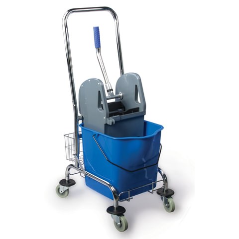 Представляет собой ведро объемом 25 л с механическим отжимом, установленное на металлической основ. База изготовлена из качественного металла, а инвентарь - из пластика. Тележка выполнена в двухцветном исполнении: синий и серый. Колеса позволяют перемещаться в произвольном направлении. Имеются защитные диски на колесах.