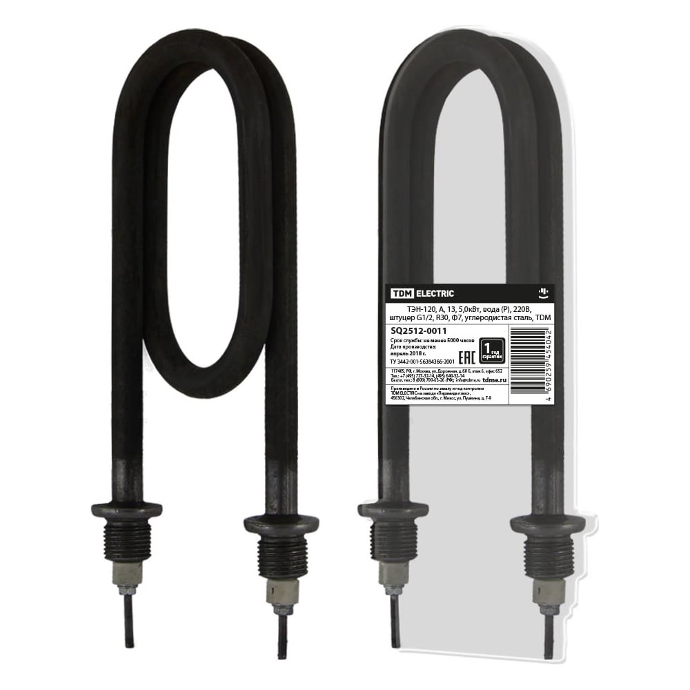 ТЭН TDM ELECTRIC 120, А, 13, 5 кВт, вода (Р), 220В, штуцер G1/2, R30, Ф7, углеродистая сталь SQ2512-0011 применяется в водонагревателях, кипятильниках, котлах отопления, умывальниках, самодельных ёмкостях для нагрева воды и прочих нагревательных устройствах. Изделие легко заменяется. Срок службы более 5000 часов. Заделка контактного стержня (А) - 40 мм Радиус гиба - 30 мм Крепежная арматура - штуцер 1/2" Диаметр оболочки - 13 мм Нагревательная среда - вода, слабый раствор щелочей (pH от 5 до 7)