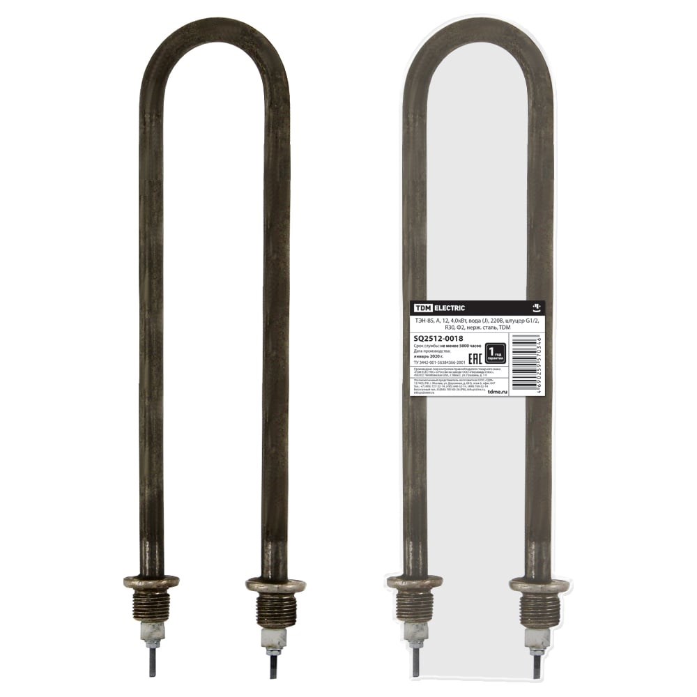 ТЭН-85 TDM ELECTRIC 12, 4,0кВт, вода J, 220В, штуцер G1/2, R30, Ф2, нержавеющая сталь SQ2512-0018 предназначен для нагрева воды, воздуха и слабых растворов щелочей. Применяется в водонагревателях, кипятильниках, котлах отопления, умывальниках, самодельных ёмкостях для нагрева воды и прочих нагревательных.