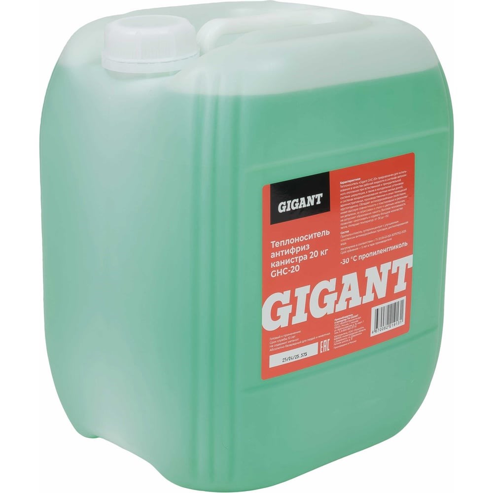 Теплоноситель антифриз Gigant ЭКО -30 С канистра 20 кг GHC-20 представляет собой надежное решение для систем отопления и охлаждения. Основой данного продукта является пропиленгликоль, что обеспечивает его безопасность и эффективность при использовании. Антифриз способен выдерживать температуры до -30 °С, что делает его идеальным для использования в условиях холодного климата. Зеленый цвет жидкости позволяет легко контролировать уровень и состояние теплоносителя в системе.