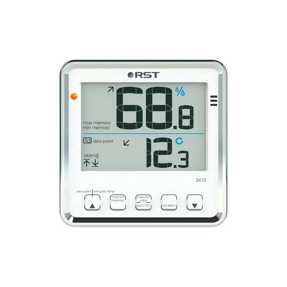 Цифровой термо-гигрометр (психрометр) с сигнальной функцией. Мониторинг температуры и относительной влажности воздуха. Расчет температуры точки росы (dew point); температуры шарика влажного термометра (wet bulb thermometer), специальный сенсор влажности RST не подвержен влиянию конденсата. Акустический и визуальный сигнал (яркий LED индикатор) о достижении минимальных и максимальных предельно допустимых значений для всех параметров. Автоматическое запоминание минимального и максимального значений полученных данных. индикатор тенденций изменения и состояния батарей. Диапазон измерения температуры: -40.0оC~ +80.0оC, разрешение 0,1оC; относительной влажности: 0.1%Rh~99.9%Rh, разрешение 0,1%Rh.