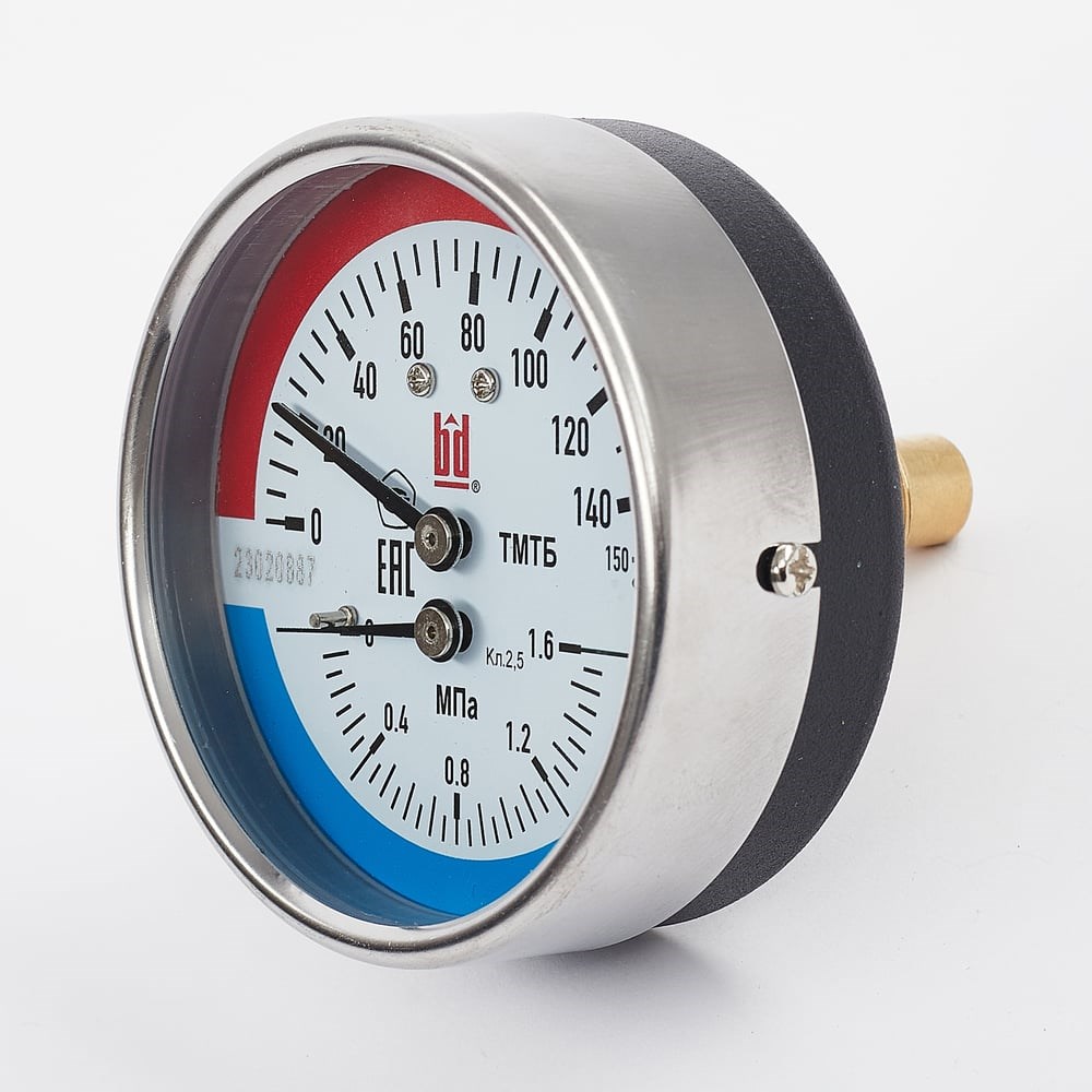 Термоманометр тип ТМТБ комбинированный прибор, для измерения давления и температуры сред, агрессивных по отношению к медным сплавам и не агрессивных по отношению к нержавеющей стали.Прибор предназначен для визуального контроля основных параметров теплоносителя (давления и температуры) в процессах, там, где обычно применяют отдельно манометр и термометр.Прибор объединяет манометр и биметаллический термометр. Термоманометр имеет циферблат с двумя шкалами и две указательных стрелки. Одна шкала служит для отсчета давления, другая для температуры.Термоманометры выпускаются двух типоразмеров: диаметром корпуса 80 и 100 мм, могут быть осевыми и радиальными. Все термоманометры комплектуются обратным клапаном.