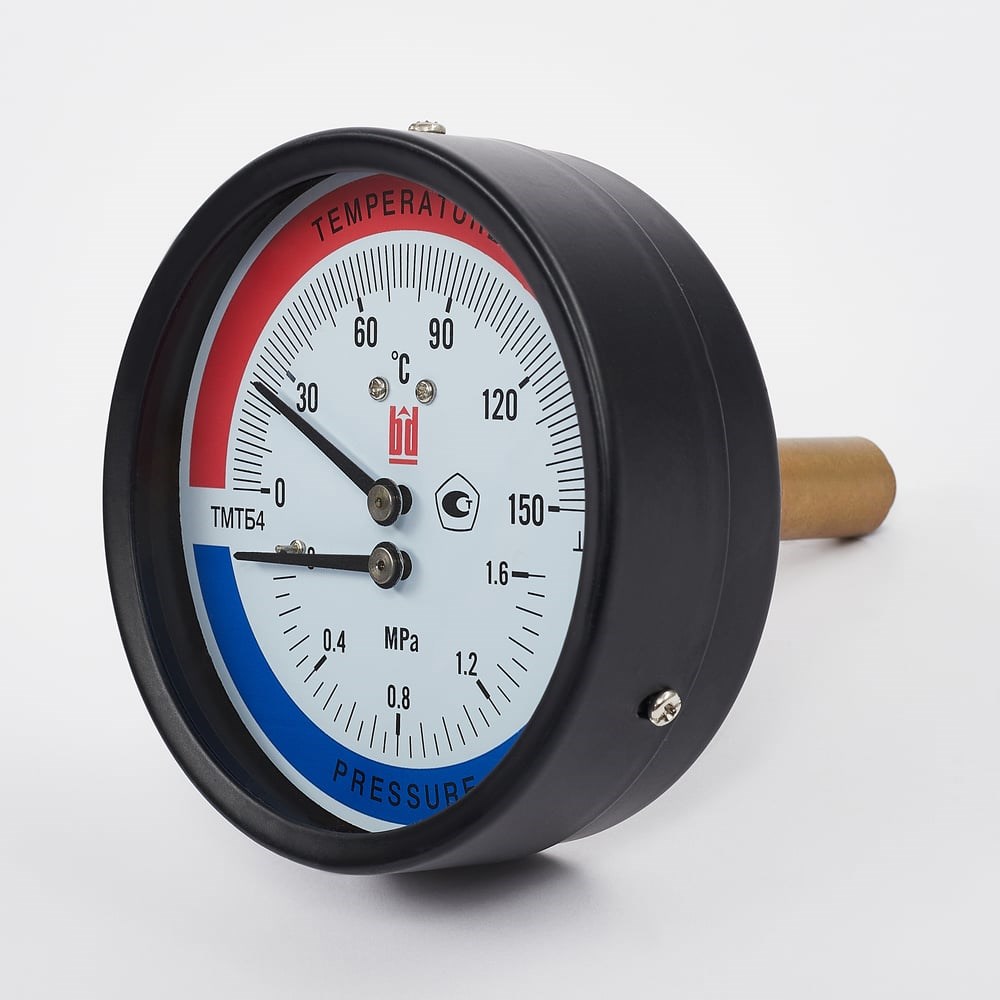 Термоманометр тип ТМТБ комбинированный прибор, для измерения давления и температуры сред, агрессивных по отношению к медным сплавам и не агрессивных по отношению к нержавеющей стали. Прибор предназначен для визуального контроля основных параметров теплоносителя (давления и температуры) в процессах, там, где обычно применяют отдельно манометр и термометр. Прибор объединяет манометр и биметаллический термометр. Термоманометр имеет циферблат с двумя шкалами и две указательных стрелки. Одна шкала служит для отсчета давления, другая для температуры. Термоманометры выпускаются двух типоразмеров: диаметром корпуса 80 и 100 мм, могут быть осевыми и радиальными. Все термоманометры комплектуются обратным клапаном.