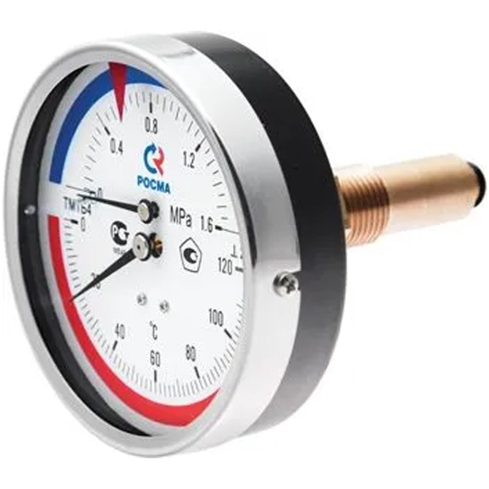 Термоманометр осевой РОСМА ТМТБ предназначен для измерения температуры и избыточного давления неагрессивных к медным сплавам сред в системах теплоснабжения и водоснабжения. Термоманометр объединяет в одном корпусе манометр и термометр, имеет циферблат с двумя шкалами и две указательных стрелки. Одна шкала служит для отсчета давления, другая - температуры. Прибор комплектуется клапаном, который служит для удобства подключения, а также позволяет демонтировать термоманометр без разгерметизации (слива) системы и остановки технологического процесса. Основные характеристики: Область применения: системы отопления, водоснабжения, бойлеры, паровые котлы и т. д Длина погружной части: 46 мм Класс точности: 2.5 Корпус: IP40, cталь 10, цвет черный Кольцо: хромированная сталь 10 Чувствительный элемент манометрической части, трибко-секторный механизм, клапан: медный сплав Чувствительный элемент термометрической части: биметаллическая спираль Стекло: минеральное Штуцер манометра: медный сплав Шток термометра: нержавеющая сталь 08Х18Н10 Межповерочный интервал: 2 года Климатическое исполнение: группа В3 по ГОСТ Р 52931; климатическое исполнение УХЛ категории 3.1 по ГОСТ 15150 Товар может отличаться от представленного на фото, при выборе ориентируйтесь на технические характеристики.