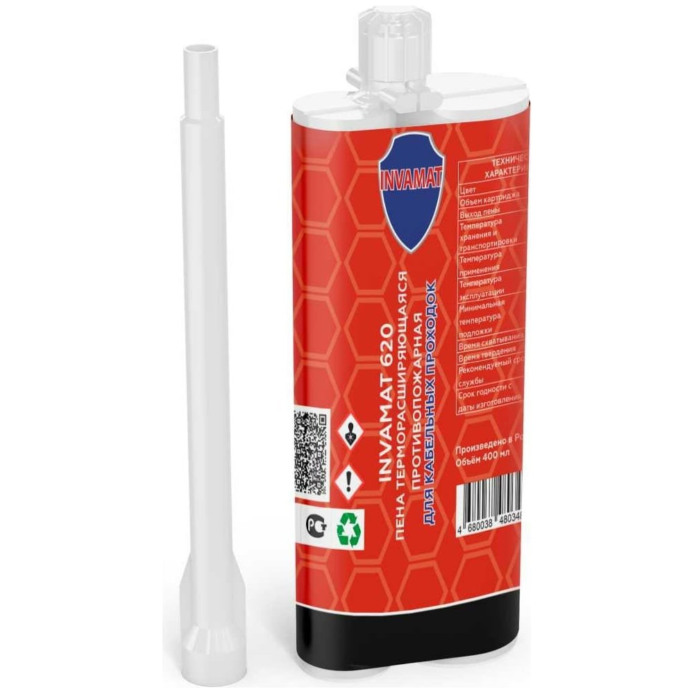 Монтажная терморасширяющаяся двухкомпонентная противопожарная пена INVAMAT 620 выход пены 2 л 1011 отвечает требованиям 123-ФЗ «ТЕХНИЧЕСКИЙ РЕГЛАМЕНТ О ТРЕБОВАНИЯХ ПОЖАРНОЙ БЕЗОПАСНОСТИ», ГОСТ Р 53310-2009 «Проходки кабельные, вводы герметичные и проходы шинопроводов. Требования пожарной безопасности. Методы испытаний на огнестойкость». Состав хорошо зарекомендовал себя при использовании в конструкциях с высокими нормами огнестойкости, используется для быстрой герметизации монтажных зазоров строительных конструкций, отверстий в перегородках, после прокладки кабелей и труб. Заполнение полости контролируется визуально. При создании огнестойкого барьера пена одновременно обеспечивает термо- и звукоизоляцию. Для нанесения используется пистолет-дозатор INVAMAT DF-620 (приобретается отдельно).