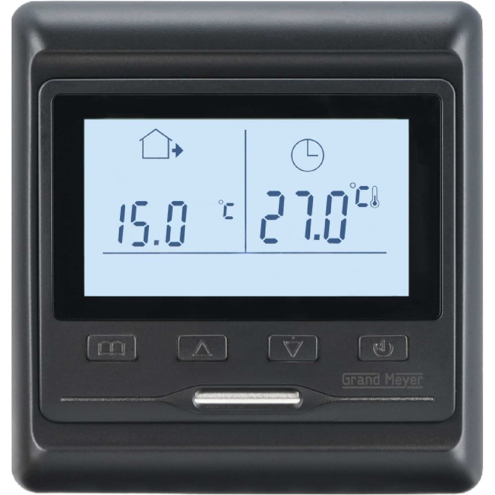 Grand Meyer HW800 черный матовый - кнопочный программируемый терморегулятор с обновленным дизайном для управления теплым полом. Возможность программируемого и ручного управления. Возможность установки недельного периода 5+2/6+1/7 дней. Память настроек при отключении питания.Встроенный воздушный датчик и выносной NTC датчик длиной 3 м. Терморегулятор управляет работой теплого пола по показаниям датчика температуры пола (входит в комплект поставки) или по показаниям датчика температуры окружающего воздуха (встроен в регулятор), или в комбинации обоих датчиков.Регулятор предназначен для скрытого (утопленного) монтажа в гнезде монтажной коробкиРабочее напряжение^ 220-240 В~ 50/60 Гц.Коммутируемый ток^20А.Выносной датчик пола: NTC датчик.Встроенный датчик воздуха: Да.Пределы регулирования: +5оС ~ +99оС (заводская +5оС ~ +35оС).Рабочая температура: -5оС ~ +50оС.Программирование: Недельный 5+2/6+1/7 дней.Защита от замерзания: Да. +5оСМатериал корпуса: Самозатухающий ПВХ.Цвет пластика: Черный матовый.Класс защиты: IP20.Размеры в сборе: 86х86х56мм.Размеры внешние: 86х86х13мм.Сертифицирован: CE, EAC.