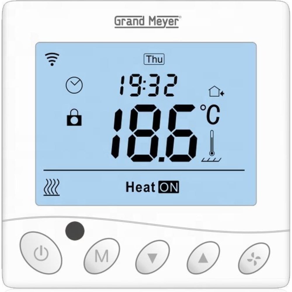 Grand Meyer W350 белый - кнопочный программируемый терморегулятор с функцией удаленного доступа по сети Wi-Fi для управления теплым полом. Терморегулятор автоматически поддерживает заданную температуру обогреваемой поверхности по показаниям датчика температуры пола (входит в комплект поставки) или по показаниям датчика температуры окружающего воздуха (встроен в регулятор), или в комбинации обоих датчиков. Имеет 3 цветовых решения корпуса: белый (W350), слоновая кость (W350i) и черный (W390). Регулятор приспособлен для скрытого (утопленного) монтажа в гнезде стандартной монтажной коробки. Напряжение питания: 230B (±10%), 50Гц Коммутируемый ток: 20 А Мощность, потребляемая регулятором при выключенной нагрузке, не более: 2 Вт Принцип регулирования: Вкл./Выкл. Выходное реле: Замыкающее Температура эксплуатации: от -5⁰С до +50⁰С Датчики температуры: Встроенный и выносной Пределы регулирования температуры: от +5 ⁰С до +95⁰С (заводские от +5 ⁰С до +35 ⁰С) Гистерезис (настраиваемый): от 0,5 ⁰С до 10 ⁰С Сопротивление выносного датчика: 10кОм при +25⁰С Длина соединительного кабеля выносного датчик: 3м Функция защиты от замерзания: Есть Режим программирования: 5+2/6+1/7 дней Параметры сети Wi-Fi: 802.11 b/g/n, 2,4Ггц Совместимость мобильного приложения: Android, iOS Материал корпуса: Самозатухающий ПВХ Степень защиты: IP20 Габаритные размеры в сборе: 86 (В) x 86 (Ш) x 46 (Г) мм Масса: 135г Внимание! Возможно отличие в цвете корпуса, оттенок может быть более теплым или холодным.