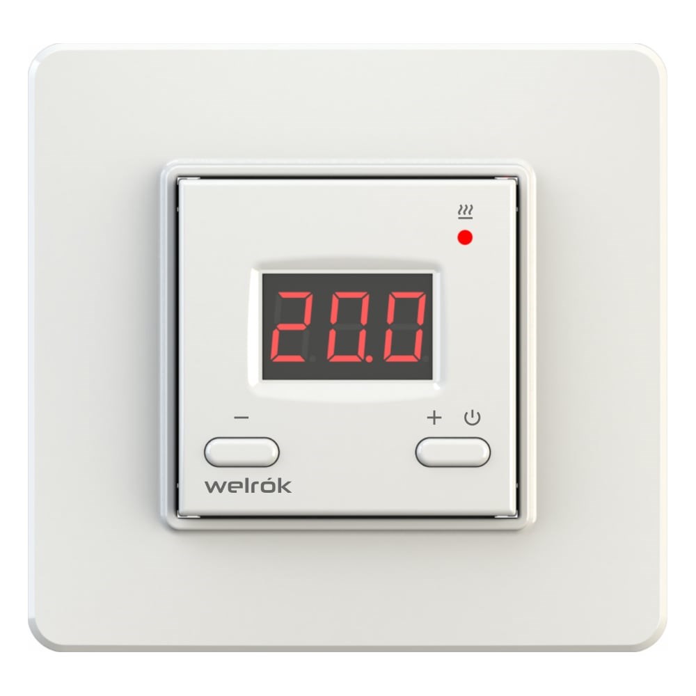 Welrok vt - цифровой терморегулятор для систем электрического отопления, таких как инфракрасные панельные обогреватели и конвекторы до 2 кВт. Термостат Welrok vt имеет встроенный термодатчик. Настройка температуры и навигация по меню осуществляется двумя кнопками и отображается на цифровом экране. Яркость экрана автоматически снижается до 30 % в режиме ожидания для комфортного использования в ночное время и экономии электроэнергии. Для оптимальной работы системы отопления необходимо установить мощность подключенной к терморегулятору нагрузки. Устанавливается в стандартный подрозетник диаметром 60 мм. Надежность и безопасность. Чтобы никто случайно не изменил параметры работы терморегулятора, можно заблокировать кнопки. Кроме того, устройство имеет защиту от перегрева: если температура внутри корпуса достигнет 85 °C, терморегулятор отключит обогрев и сообщит об этом. Когда температура снизится до 80 °C, терморегулятор возобновит работу.