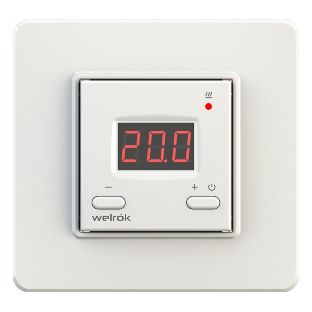 Широкое применение Welrok st - цифровой терморегулятор для управления электрическим и водяным теплым полом. Управление водяными теплыми полами осуществляется с помощью нормально закрытого электротермического сервопривода с рабочим напряжением 230 В. Термостат Welrok st поддерживает постоянную заданную температуру в диапазоне от 5 до 40 градусов Цельсия. Измерение температуры обеспечивает выносной датчик, который идет в комплекте с устройством. Комфорт эксплуатации Настройка температуры и навигация по меню осуществляется двумя кнопками и отображается на цифровом экране. Яркость экрана автоматически снижается до 30 % в режиме ожидания для комфортного использования в ночное время и экономии электроэнергии. Устанавливается в стандартный подрозетник диаметром 60 мм. Надежность и безопасность Welrok st обладает функцией блокировки кнопок для безопасности и защитой от перегрева. Если температура внутри корпуса превысит 85°C, терморегулятор автоматически выключится. При снижении температуры до 80°C терморегулятор включится автоматически.