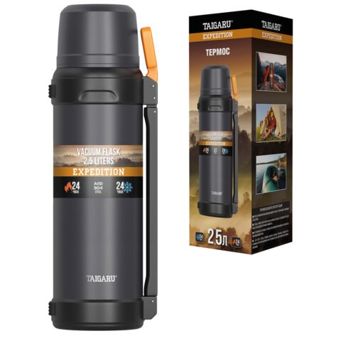 Термос 2,5 л TAIGARU (ТАЙГАРУ) EXPEDITION, нержавеющая сталь SUS304, 2 кружки, 2 ручки, ситечко, графитовый, 700318