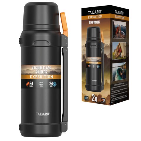 Термос 2 л TAIGARU (ТАЙГАРУ) EXPEDITION, нержавеющая сталь SUS304, 2 кружки, 2 ручки, ситечко, черный, 700317