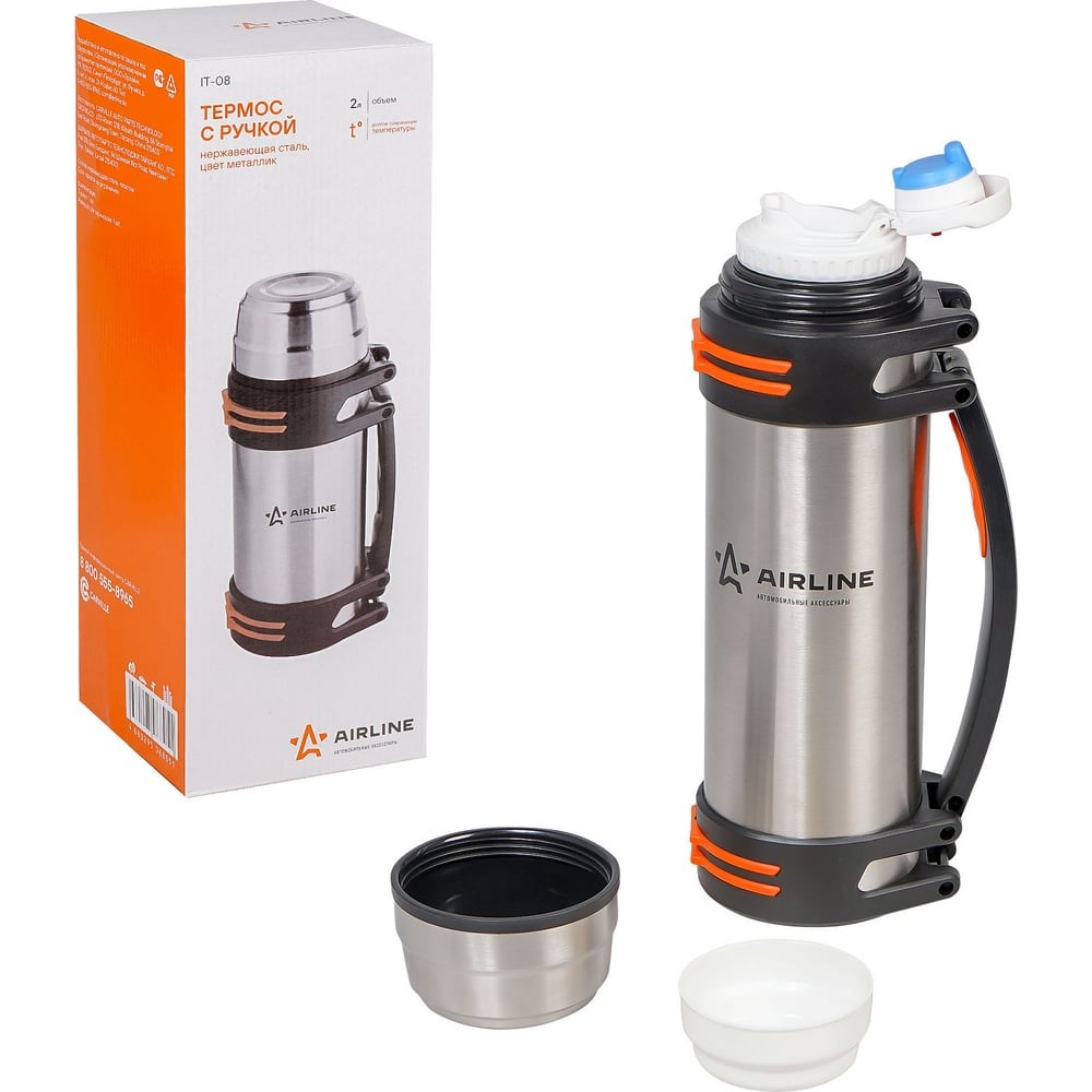 Термос с ручкой Airline 2.0 л, нержавеющая сталь, цвет металлик IT-08 – это вид бытовой теплоизоляционной посуды для продолжительного сохранения более высокой или низкой температуры продуктов питания. Представляет собой 2-х литровую емкость из 304 нержавеющей стали с двойными стенками и герметичной пластиковой крышкой с системой быстрого открывания. Термос будет полезен в домашнем быту и незаменим для дальних поездок. В комплекте имеет две кружки, складную ручку, ремешок для переноски, а также герметичную крышку с системой быстрого открывания. Преимущества Две кружки Ремень для переноски Складная ручка Ножки для горизонтального хранения Герметичная крышка с механизмом открытия Долгое сохранение температуры