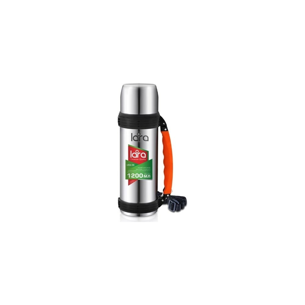 Термос Lara 1,2л, ручка, кнопка, ремешок, двойные стенки, крышка-стаканчик, нержавеющая сталь LR04-03 подходит для походов и путешествий.  Двойные стенки отлично удерживают тепло и холод в течение длительного времени. Очень удобно в походных условиях использовать крышку в качестве чашки.