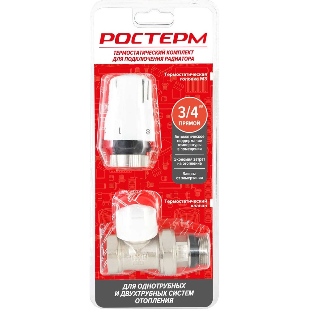 Клапан термостатический прямой РОСТерм 3/4" с термоголовкой для радиатора используются для автоматического поддержания заданной температуры помещения посредством управления потоком теплоносителя в приборе отопления. Необходимая температура подбирается вручную, а после этого термостат самостоятельно регулирует подачу воды для сохранения заданных параметров.Термостатическая головка РОСТерм М3 — автоматически поддерживает заданную температуру в помещении, регулируя поток теплоносителя в радиаторе;Термостатический клапан М30*1,5 — устанавливается на подающей трубе перед радиатором и служит для регулирования расхода теплоносителя;Преимущества: - Автоматическое регулирование температуры. - Повышение эффективности системы отопления: предотвращает перегрев или переохлаждение помещения. - Качественные материалы обеспечивают долгий срок службы. - Может использоваться в однотрубных и двухтрубных системах водяного отопления. Выгода: - Эффективное использование энергии, снижение расходов. - Функция защита системы от замерзания. - Установка температуры в диапазоне от 6,5 до 28 °C с точностью до 2 °C.Важно! При установке термоголовки необходимо установить положение термоголовки на 5 и только потом устанавливать на термостатический клапан, в противном случае термоголовка может работать некорректно (фиксируется резьбой, но шток термоголовки не плотно прижат к штоку клапана). После установки можно установить значение термоголовки согласно таблице температур.