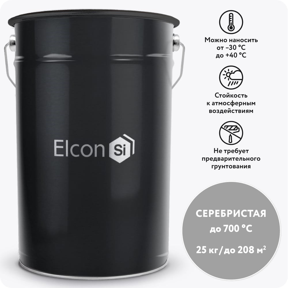 Термостойкая кремнийорганическая эмаль Elcon Max Therm серебристая (RAL 9006) 700 градусов 25 кг 00-00000012Термостойкая эмаль Elcon Max Therm предназначена для защитной окраски поверхностей, эксплуатируемых при температурах от -60°C до +1200°C. Данная жаростойкая краска обеспечивает долговременную антикоррозионную защиту и сохраняет свои свойства при постоянном воздействии высоких температур. Может применяться как внутри помещений, так и для наружных работ.Свойства:•Термостойкость: выдерживает температуры от -60°C до +1200°C (в зависимости от цвета).•Универсальность: термостойкая эмаль подходит для металла, бетона, кирпича и других минеральных поверхностей•Быстрая сушка: время высыхания «на отлип» — 30 минут при +20°C.•Долговечность: срок службы покрытия — не менее 15 лет.•Химическая стойкость: устойчива к маслам, нефтепродуктам, растворам солей.•Высокая коррозионная стойкость: обеспечивает надежную защиту от атмосферных воздействий и агрессивных сред.•Всесезонность: возможно нанесение при отрицательных температурах до -30°CОбласти применения:Промышленное оборудование: печи, котлы, теплообменники, газо- и нефтепроводы.Автомобильные компоненты: суппорты, радиаторы, выпускные системы.Системы отопления: радиаторы, трубопроводы, котлы.Бытовые конструкции: печи, камины, мангалы, дымоходы.Строительные конструкции: металлические, бетонные и кирпичные поверхности, требующие термозащиты.