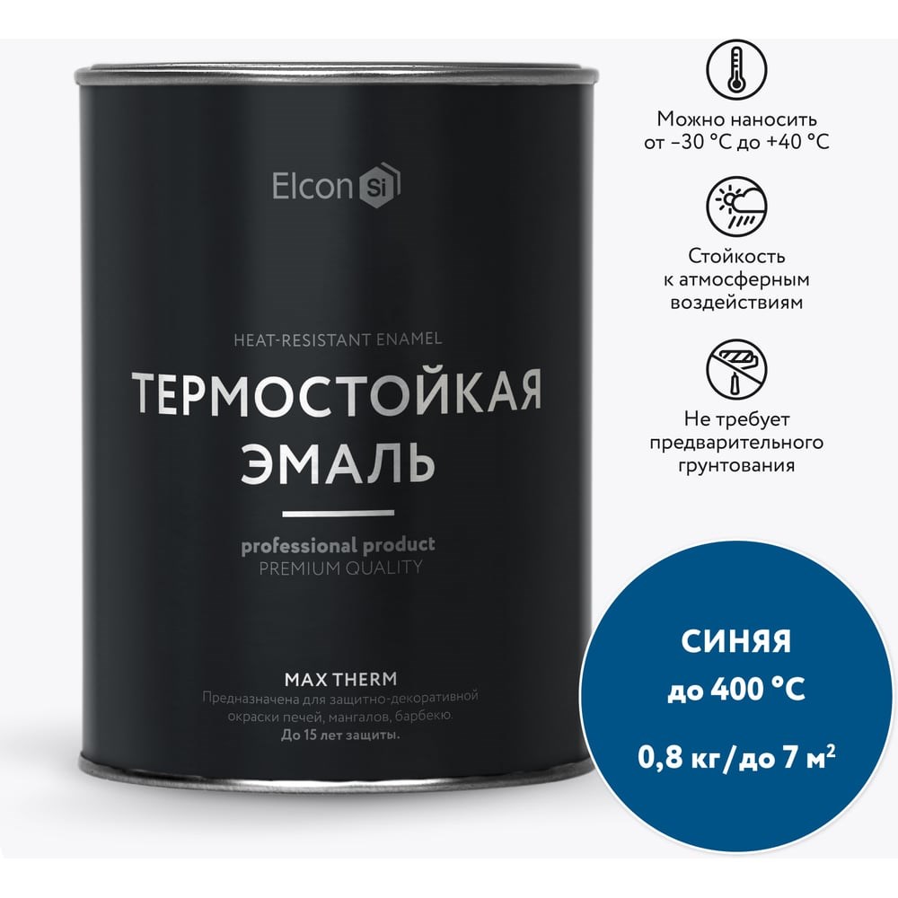 Термостойкая краска для металла, печей, мангалов, радиаторов, дымоходов, суппортов Elcon Max Therm синяя, 400 градусов, 0,8 кг 00-00002894Термостойкая краска Elcon Max Therm — это термостойкая эмаль для металла, предназначенная для защитной окраски поверхностей, эксплуатируемых при температурах от -60°C до +1200°C. Данная жаростойкая краска обеспечивает долговременную антикоррозионную защиту и сохраняет свои свойства при постоянном воздействии высоких температур. Может применяться как внутри помещений, так и для наружных работ.Свойства:•Термостойкость: Выдерживает температуры от -60°C до +1200°C (в зависимости от цвета).•Универсальность: Термостойкая эмаль подходит для металла, бетона, кирпича и других минеральных поверхностей•Быстрая сушка: Время высыхания «на отлип» — 30 минут при +20°C.•Долговечность: Срок службы покрытия — не менее 15 лет.•Химическая стойкость: Устойчива к маслам, нефтепродуктам, растворам солей.•Высокая коррозионная стойкость: Обеспечивает надежную защиту от атмосферных воздействий и агрессивных сред.•Всесезонность: Возможно нанесение при отрицательных температурах до -60°CОбласти применения:Промышленное оборудование: печи, котлы, теплообменники, газо- и нефтепроводы.Автомобильные компоненты: суппорты, радиаторы, выпускные системы.Системы отопления: радиаторы, трубопроводы, котлы.Бытовые конструкции: печи, камины, мангалы, дымоходы.Строительные конструкции: металлические, бетонные и кирпичные поверхности, требующие термозащиты.