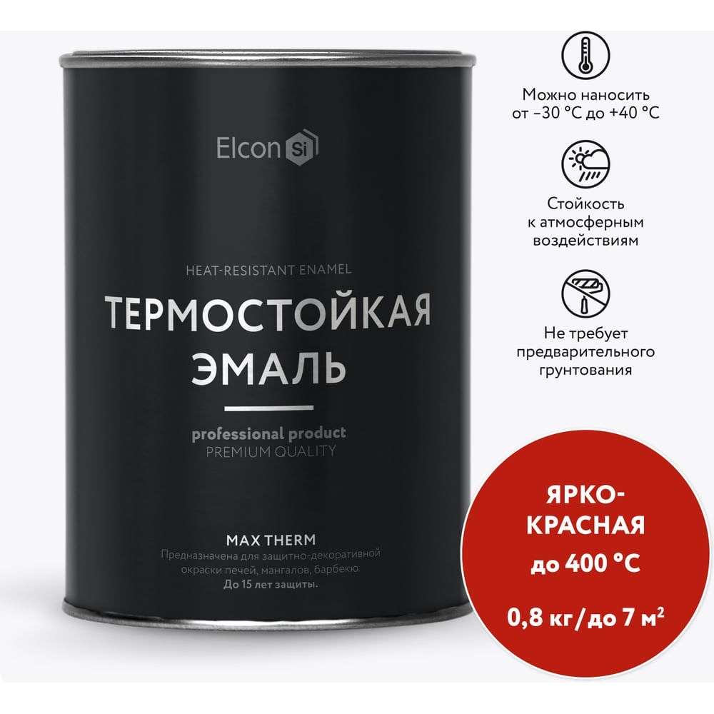Термостойкая краска для металла, печей, мангалов, радиаторов, дымоходов, суппортов Elcon Max Therm ярко-красная 0,8 кг 00-00002899 предназначена для антикоррозионной защиты металлоконструкций, оборудования, печей для саун, дымовых труб, выхлопных систем автомобилей, деталей двигателей, емкостного оборудования, подвергающихся в процессе эксплуатации воздействию температур от -60 °С до +400 °С*, а также для окраски минеральных поверхностей, длительно эксплуатируемых в условиях умеренного климата.*Термостойкость покрытия зависит от цвета и может составлять от +400 °С до +1200 °С Важно! Для обеспечения требуемых свойств покрытия необходимо провести термозакалку: выдержать при температуре окружающего воздуха в течение не менее 30минут, затем нагреть до температуры >250°C со скоростью 3,5°C в минуту и поддерживать эту температуру не менее 3часов. При достижении температуры 250°С покрытие начнет слегка дымиться, что является нормальным и свидетельствует о том, что идет процесс термозакалки.Для разбавления эмали и обезжиривания поверхности рекомендуем использовать растворитель Elcon RОбласти применения:ПечиОборудованиеМангалыКотлыТрубопроводыМеталлоконструкцииСуппортаВыхлопные системыДетали двигателяРадиаторыТрубы отопления