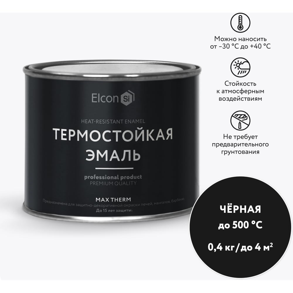 Термостойкая краска для металла, печей, мангалов, радиаторов, дымоходов, суппортов Elcon Max Therm черная, 500 градусов, 0.4 кг 00-00002907 предназначена для антикоррозионной защиты металлоконструкций, оборудования, печей для саун, дымовых труб, выхлопных систем автомобилей, деталей двигателей, емкостного оборудования, подвергающихся в процессе эксплуатации воздействию температур от -60 °С до +500 °С*, а также для окраски минеральных поверхностей, длительно эксплуатируемых в условиях умеренного климата.*Термостойкость покрытия зависит от цвета и может составлять от +400 °С до +1200 °СВажно! Для обеспечения требуемых свойств покрытия необходимо провести термозакалку: выдержать притемпературе окружающего воздуха втечение неменее 30минут, затем нагреть дотемпературы >250°C соскоростью3,5°C вминуту иподдерживать этутемпературу неменее 3часов. Придостижении температуры 250°С покрытие начнет слегка дымиться, чтоявляется нормальным исвидетельствует отом, что идет процесс термозакалки.Области применения:ПечиОборудованиеМангалыКотлыТрубопроводыМеталлоконструкцииСуппортаВыхлопные системыДетали двигателяРадиаторыТрубы отопления