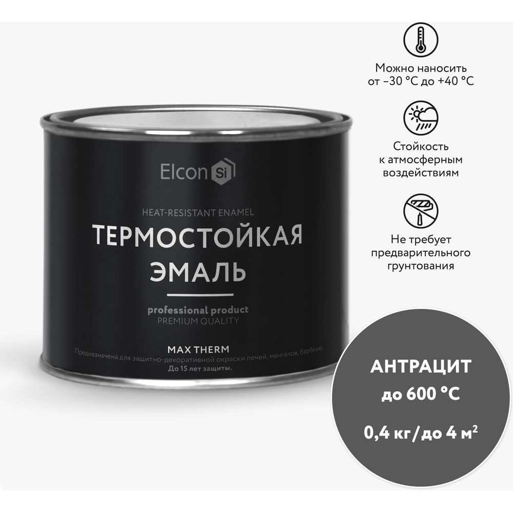 Термостойкая краска Elcon Max Therm для металла, печей, мангалов, радиаторов, дымоходов, суппортов, антрацит, 600 градусов, 0,4 кг 00-00002914Термостойкая краска Elcon Max Therm — это термостойкая эмаль для металла, предназначенная для защитной окраски поверхностей, эксплуатируемых при температурах от -60°C до +1200°C. Данная жаростойкая краска обеспечивает долговременную антикоррозионную защиту и сохраняет свои свойства при постоянном воздействии высоких температур. Может применяться как внутри помещений, так и для наружных работ.Свойства:•Термостойкость: Выдерживает температуры от -60°C до +1200°C (в зависимости от цвета).•Универсальность: Термостойкая эмаль подходит для металла, бетона, кирпича и других минеральных поверхностей•Быстрая сушка: Время высыхания «на отлип» — 30 минут при +20°C.•Долговечность: Срок службы покрытия — не менее 15 лет.•Химическая стойкость: Устойчива к маслам, нефтепродуктам, растворам солей.•Высокая коррозионная стойкость: Обеспечивает надежную защиту от атмосферных воздействий и агрессивных сред.•Всесезонность: Возможно нанесение при отрицательных температурах до -60°CОбласти применения:Промышленное оборудование: печи, котлы, теплообменники, газо- и нефтепроводы.Автомобильные компоненты: суппорты, радиаторы, выпускные системы.Системы отопления: радиаторы, трубопроводы, котлы.Бытовые конструкции: печи, камины, мангалы, дымоходы.Строительные конструкции: металлические, бетонные и кирпичные поверхности, требующие термозащиты.