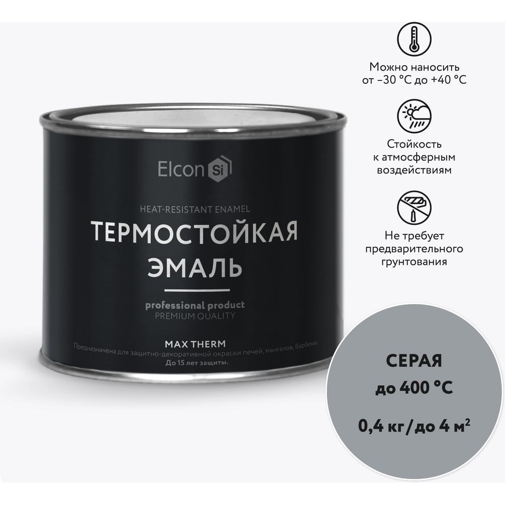 Термостойкая краска для металла, печей, мангалов, радиаторов, дымоходов, суппортов Elcon Max Therm серая, 400 градусов, 0,4 кг 00-00002916 предназначена для антикоррозионной защиты металлоконструкций, оборудования, печей для саун, дымовых труб, выхлопных систем автомобилей, деталей двигателей, емкостного оборудования, подвергающихся в процессе эксплуатации воздействию температур от -60 °С до +400 °С, а также для окраски минеральных поверхностей, длительно эксплуатируемых в условиях умеренного климата.Важно! Для обеспечения требуемых свойств покрытия необходимо провести термозакалку: выдержать при температуре окружающего воздуха в течение не менее 30минут, затем нагреть до температуры >250°C со скоростью 3,5°C в минуту и поддерживать эту температуру не менее 3часов. При достижении температуры 250°С покрытие начнет слегка дымиться, что является нормальным и свидетельствует о том, что идет процесс термозакалки.Области применения:ПечиОборудованиеМангалыКотлыТрубопроводыМеталлоконструкцииСуппортаВыхлопные системыДетали двигателяРадиаторыТрубы отопления