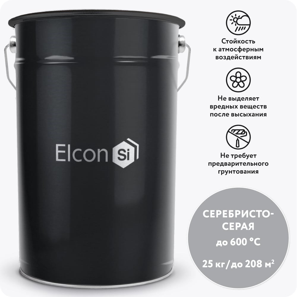 Термостойкая эмаль Elcon КО-8104 серебристо-серая, 600 градусов, 25 кг 00-00003979 предназначена для защитного окрашивания металлических конструкций, эксплуатирующихся в условиях повышенных температур (трубопроводы, котлы, печи для сжигания отходов, автомобильная система выхлопа). Состав подходит для декоративной окраски бетонных, каменных и кирпичных поверхностей. Финишное покрытие обладает хорошей устойчивостью к образованию коррозии, воздействию нефтепродуктов, солей и минеральных масел.