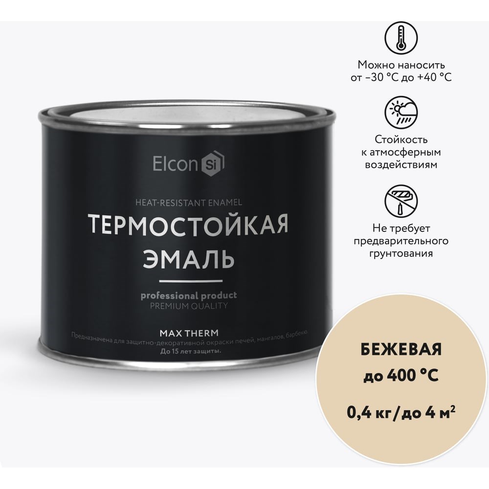 Термостойкая краска для металла, печей, мангалов, радиаторов, дымоходов, суппортов Elcon Max Therm бежевая, 400 градусов, 0,4 кг 00-00002925Термостойкая краска Elcon Max Therm — это термостойкая эмаль для металла, предназначенная для защитной окраски поверхностей, эксплуатируемых при температурах от -60°C до +1200°C. Данная жаростойкая краска обеспечивает долговременную антикоррозионную защиту и сохраняет свои свойства при постоянном воздействии высоких температур. Может применяться как внутри помещений, так и для наружных работ.Свойства:•Термостойкость: Выдерживает температуры от -60°C до +1200°C (в зависимости от цвета).•Универсальность: Термостойкая эмаль подходит для металла, бетона, кирпича и других минеральных поверхностей•Быстрая сушка: Время высыхания «на отлип» — 30 минут при +20°C.•Долговечность: Срок службы покрытия — не менее 15 лет.•Химическая стойкость: Устойчива к маслам, нефтепродуктам, растворам солей.•Высокая коррозионная стойкость: Обеспечивает надежную защиту от атмосферных воздействий и агрессивных сред.•Всесезонность: Возможно нанесение при отрицательных температурах до -60°CОбласти применения:Промышленное оборудование: печи, котлы, теплообменники, газо- и нефтепроводы.Автомобильные компоненты: суппорты, радиаторы, выпускные системы.Системы отопления: радиаторы, трубопроводы, котлы.Бытовые конструкции: печи, камины, мангалы, дымоходы.Строительные конструкции: металлические, бетонные и кирпичные поверхности, требующие термозащиты.