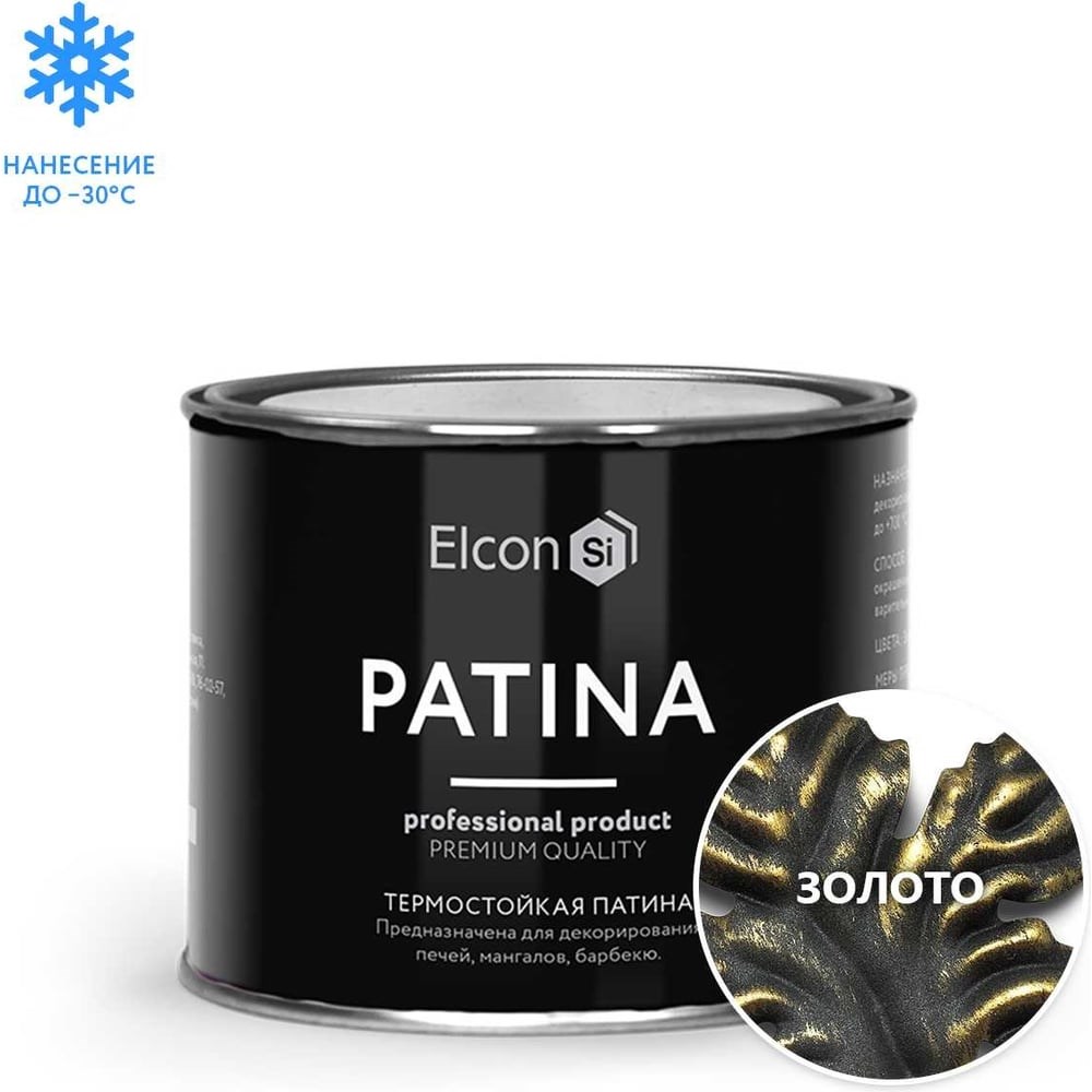 Термостойкая патина Elcon Patina золото 0,2 кг 00-00461414 Краска патина Elcon Patina предназначена для художественно-декоративной отделки под благородную старину деревянных, бетонных, металлических поверхностей и кованых изделий. Декоративная краска может применяться как для окрашивания цветных металлов, так и для окрашивания стали, чугуна, железа различных форм и размеров, эксплуатируемых в атмосферных условиях и при перепадах температур от –60 °С до +150 °С.Свойства:• Стойкость к атмосферным воздействиям • Термостойкость до +150 °С • Нанесение от -30 °С до +40 °С • Время высыхания «на отлип» при температуре +20°C - до 30 мин • Высокая коррозионная стойкостьОбласти применения:• Создание декоративного эффекта старины на предметах интерьера и мебели • Защита и декор уличных конструкций, кованых изделий, дверей, фигурных оград, ворот, памятников • Краска по металлу, дереву, бетону, камню, кирпичу и другим минеральным поверхностям