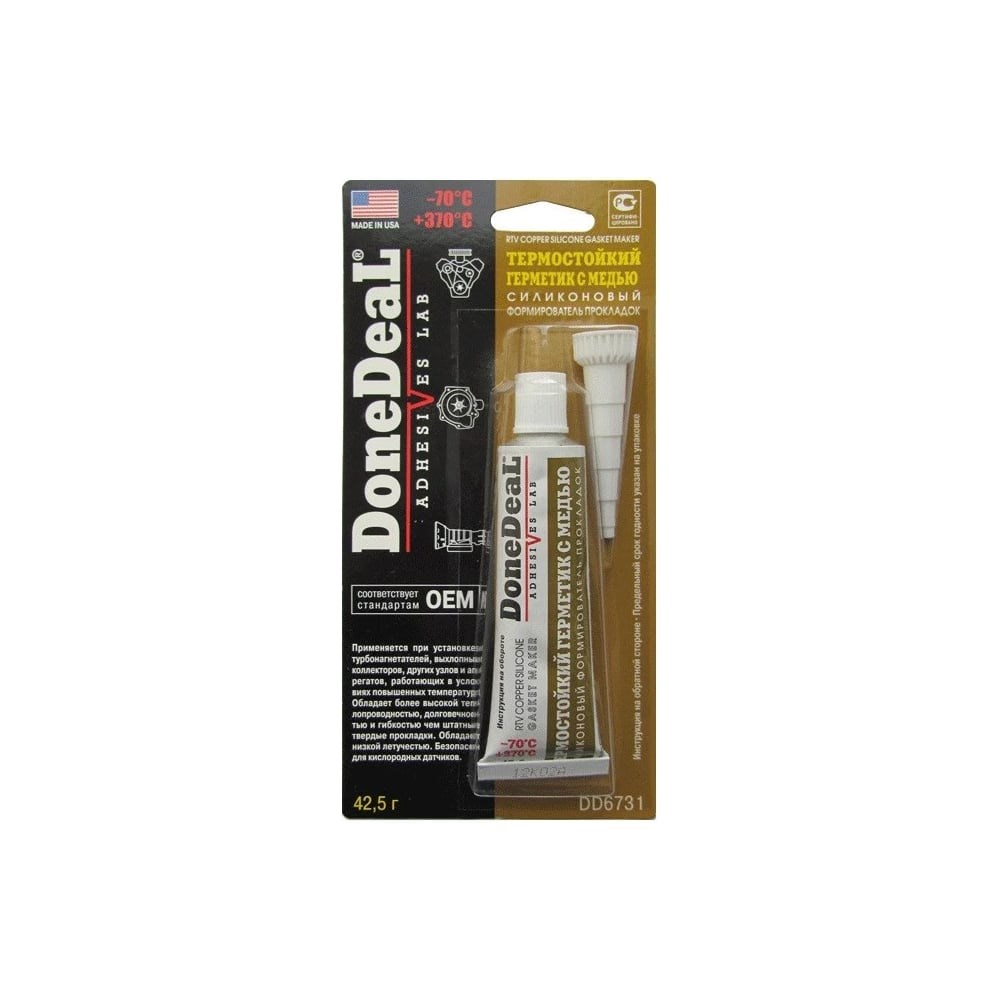 Термостойкий силиконовый герметик-формирователь прокладок Done Deal с медью DD6731 используют во время монтажа турбонагнетателей, выхлопных коллекторов и механических узлов, работающих при повешенной температуре. Продукт надежно герметизирует соединения и заменяет штатные прокладки из резины и силикона. Состав подходит для ремонта деталей, подлежащих длительной безразборной эксплуатации.