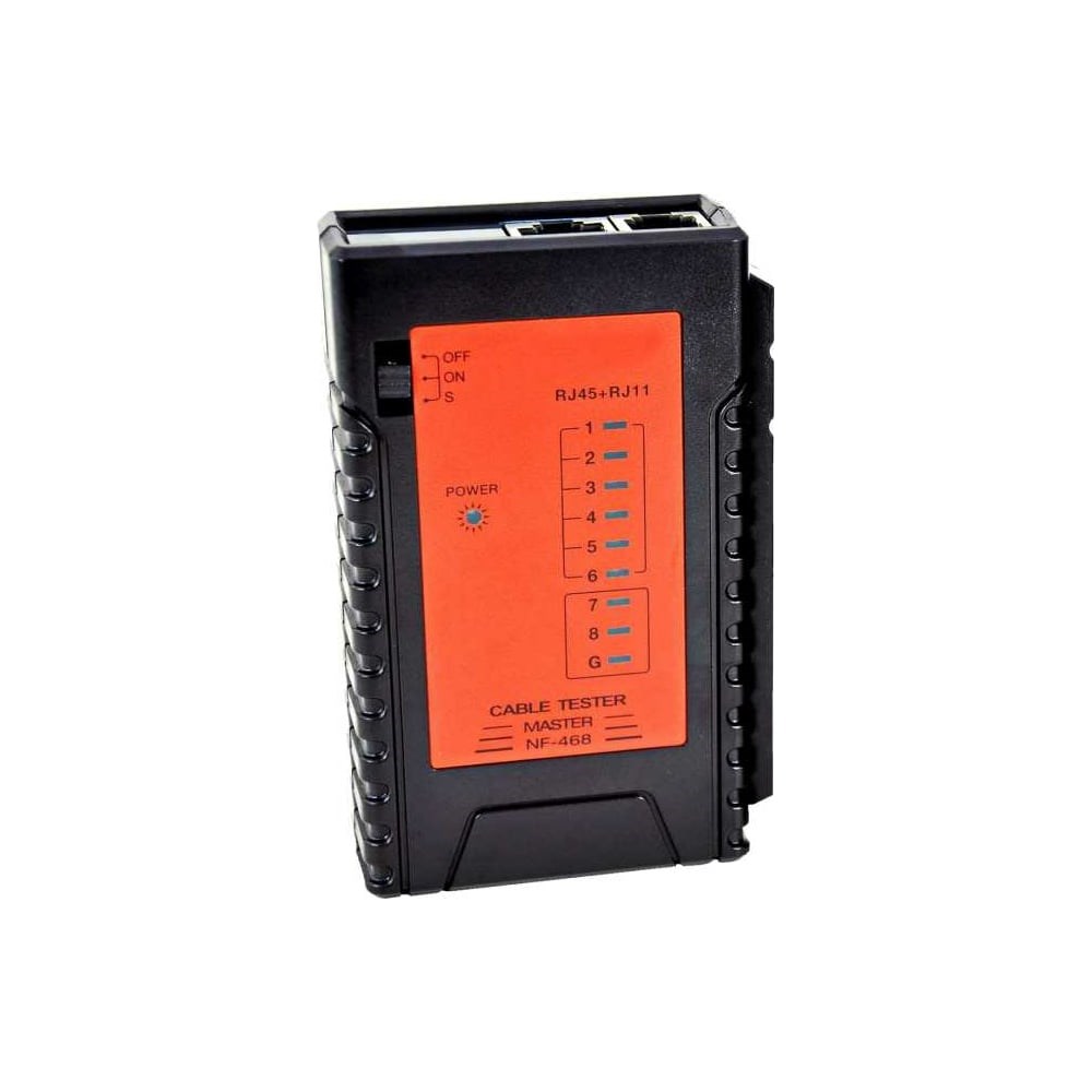 Тестер кабеля Netlink NF-468 (RJ-45 + RJ-11) 00000000016 позволяет тестировать кабель, оконцованный коннекторами RJ-45, RJ-11, BNC. Состоит из активной и пассивной части. Активная часть питается от батарейки типа Крона. С помощью этого тестера можно протестировать линию на правильность разводки, обрыв, короткое замыкание и полярность пар. Устройство выполняет: Проверку целостности кабеля. Тестирование соединения LAN кабелем (витая пара) категорий 3, 5, 5е, 6. Обнаружение обрыва и определение расстояния до обрыва. Обнаружение ошибок в схеме разводки, замыкания, обрывы, кросс-соединения. Проверка полярности пар.