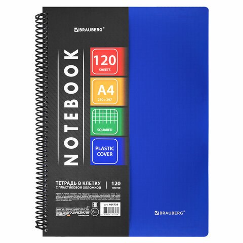 Тетрадь обложка пластик, А4, 120 л., спираль пластик, клетка, BRAUBERG "Metropolis", синий, 404739