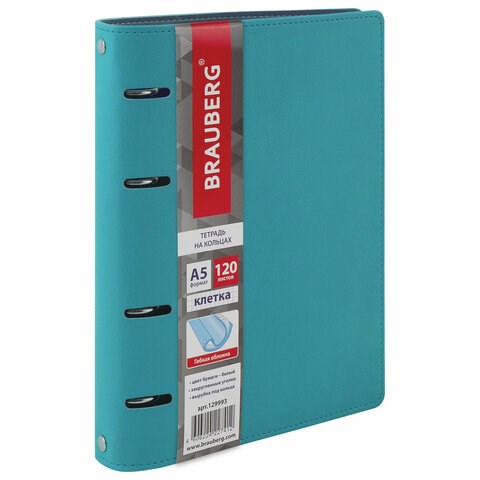 Тетрадь на кольцах А5 (180х220 мм), 120 листов, под кожу, клетка, BRAUBERG "Joy", бирюзовый/серо-голубой, 129993