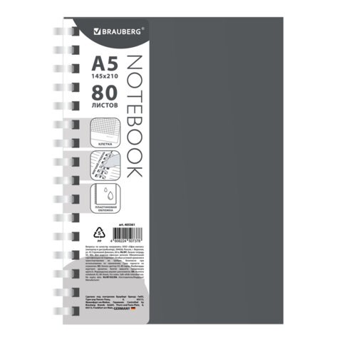 Тетрадь обложка пластик, А5 80 л., гребень мягкий (силиконовый), клетка, BRAUBERG, серый, 405361
