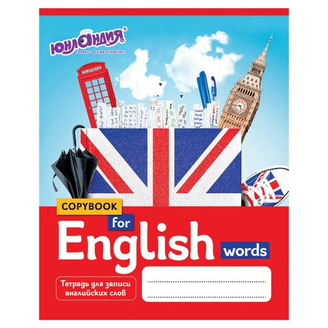 Тетрадь содержит 48 листов формата А5 (165х205 мм). Изготовлена из высококачественной офсетной бумаги плотностью 60 г/м2 и белизной 100%. Листы соединены скобами. Специальная линовка блока. Обложка выполнена из мелованного картона плотностью 190 г/м2. В справочном материале собраны базовые данные по английскому языку - алфавит, времена, глаголы и пр.