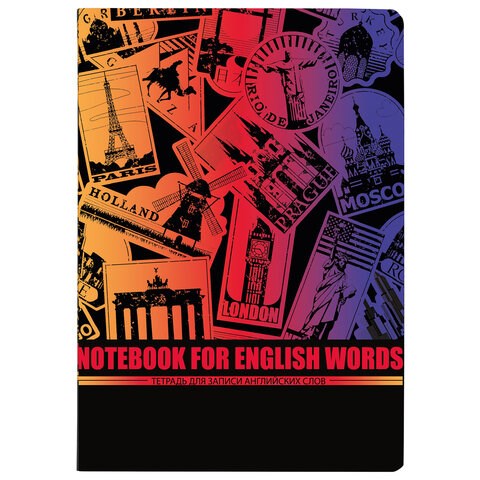 Тетрадь содержит 60 листов формата А5 (148х210 мм). Изготовлена из высококачественной офсетной бумаги плотностью 70 г/м2 и белизной 100%. Сшивка плотно соединяет листы. Специальная линовка блока. Обложка выполнена из экокожи. В справочном материале собраны базовые данные по английскому языку - алфавит, времена, глаголы и пр.
