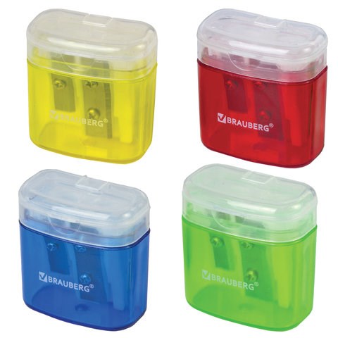 Точилка BRAUBERG "Chief", 2 отверстия для чернографитных и цветных карандашей, с контейнером, с крышкой, ассорти, 226942