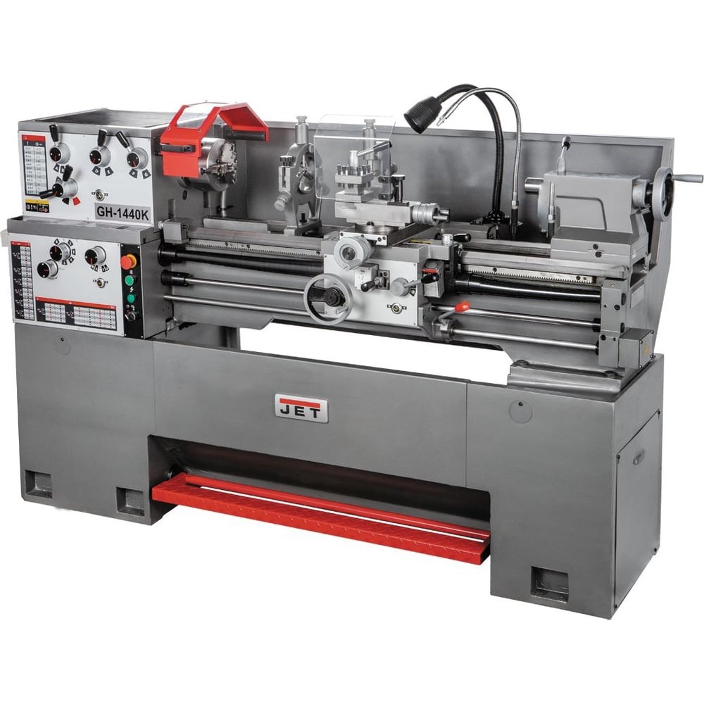 Токарный станок по металлу, 400 В JET GH-1440K DRO 50000917T представляет собой современное оборудование для промышленного производства. Система станка позволяет обтачивать детали различного диаметра, а также нарезать метрическую и дюймовую резьбу. Для безопасности изделие оборудовано защитным экраном, подсветкой и подачей охлаждающей жидкости. Переключение скоростей осуществляется слева, что позволяет большинству людей работать максимально эффективно. В нижней части располагается подставка для ноги, что позволяет увеличить усилие при работе. Точеные рукоятки системы управления хорошо ложатся в ладонь. Станок поставляется на прочной тумбе, которая поглощает вибрации и значительно увеличивает комфорт от работы.