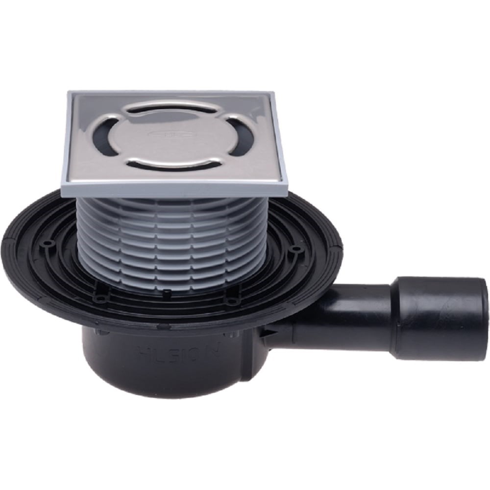Трап для внутренних помещений с горизонтальным выпуском DN40/50, с надставным элементом и подрамником из ПП и решеткой из нержавеющей стали для предотвращения попадания в канализацию посторонних предметов, и с «сухим» сифоном, не пропускающим запах из канализации при высыхании воды в гидрозатворе.