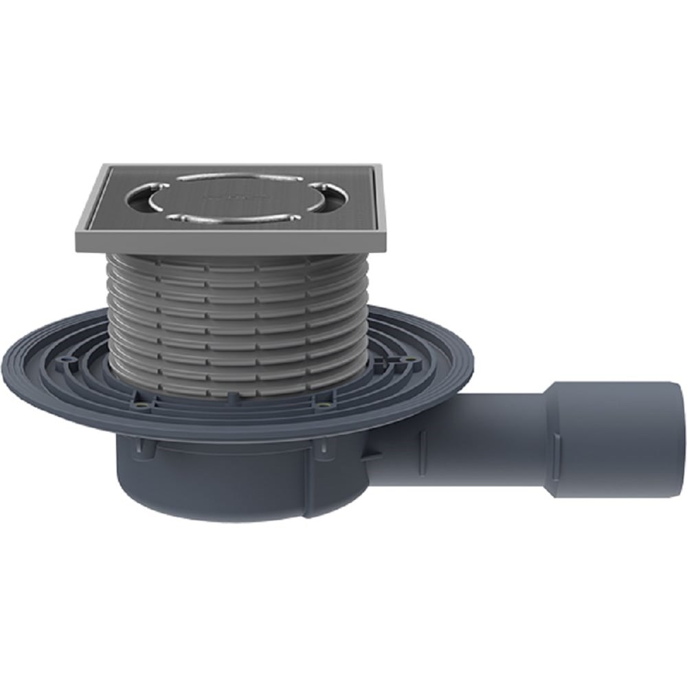 Трап с горизонтальным выпуском DN40/50, с корпусом из полипропилена, надставным элементом из полипропилена, с подрамником из полипропилена, чугуна или нержавеющей стали, с полимербитумным полотном 500х500 мм или без него, с «сухим» сифоном Primus.
