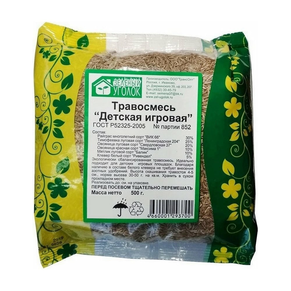 Семена газона Зеленый уголок травосмесь Детская Игровая, 0.5 кг 4660001293700 используется для создания так называемых детских игровых газонов, отвечающих высоким требованиям по безопасности в использовании и эксплуатации. Благодаря наличию в составе белого клевера не требует внесения азотных удобрений. Высота скашивания 4-5 см, норма высева 3-5 кг на 100 м2.